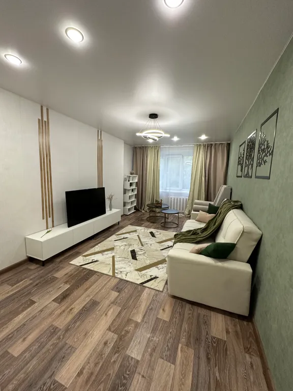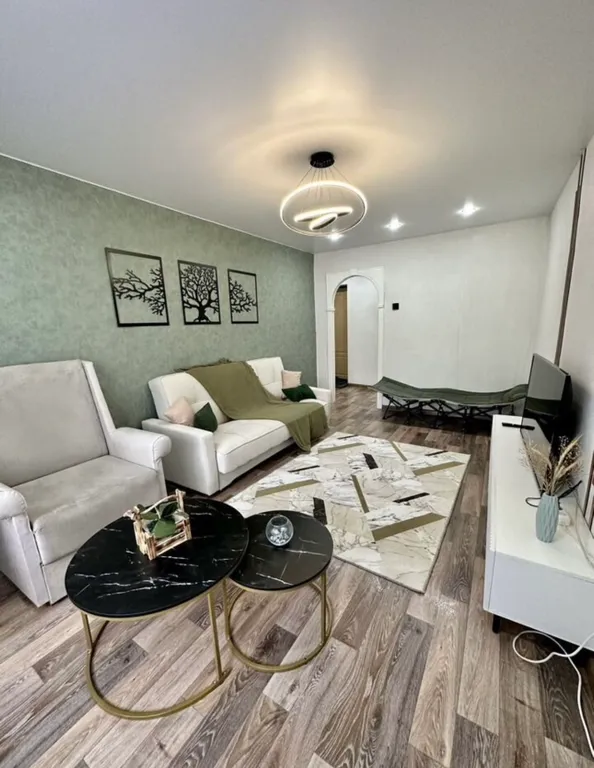 В комнате установлен удобный диван и телевизор, а также кресло-кровать и раскладушка с удобным матрасом. Из окон открывается вид на улицу, что добавляет свет и свежесть в интерьер.