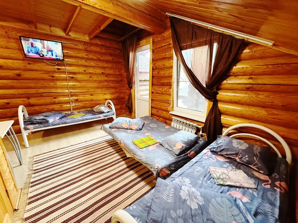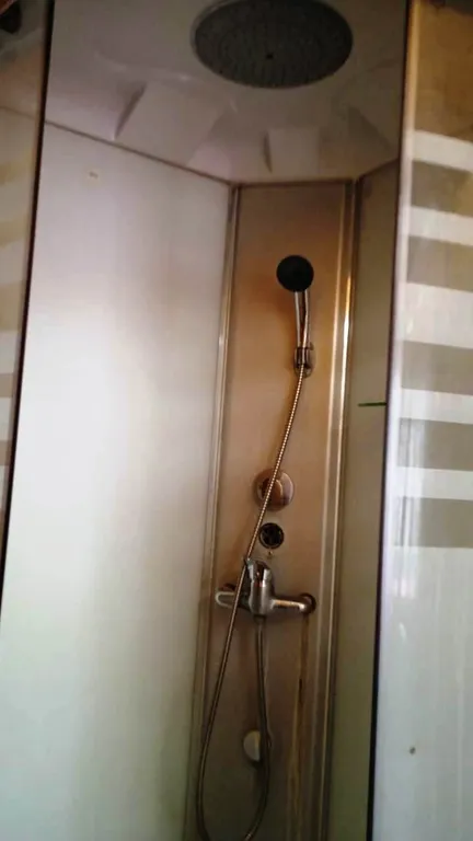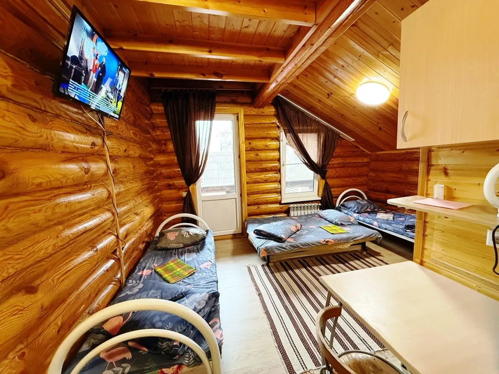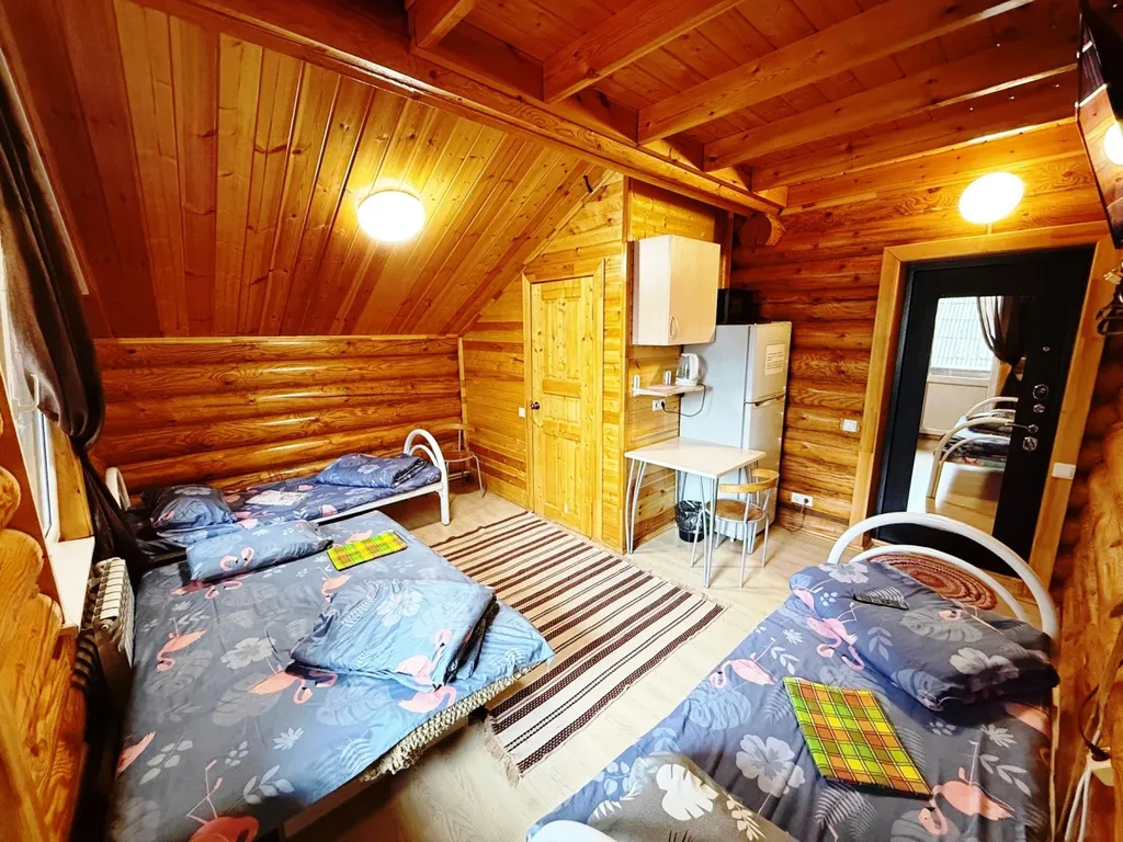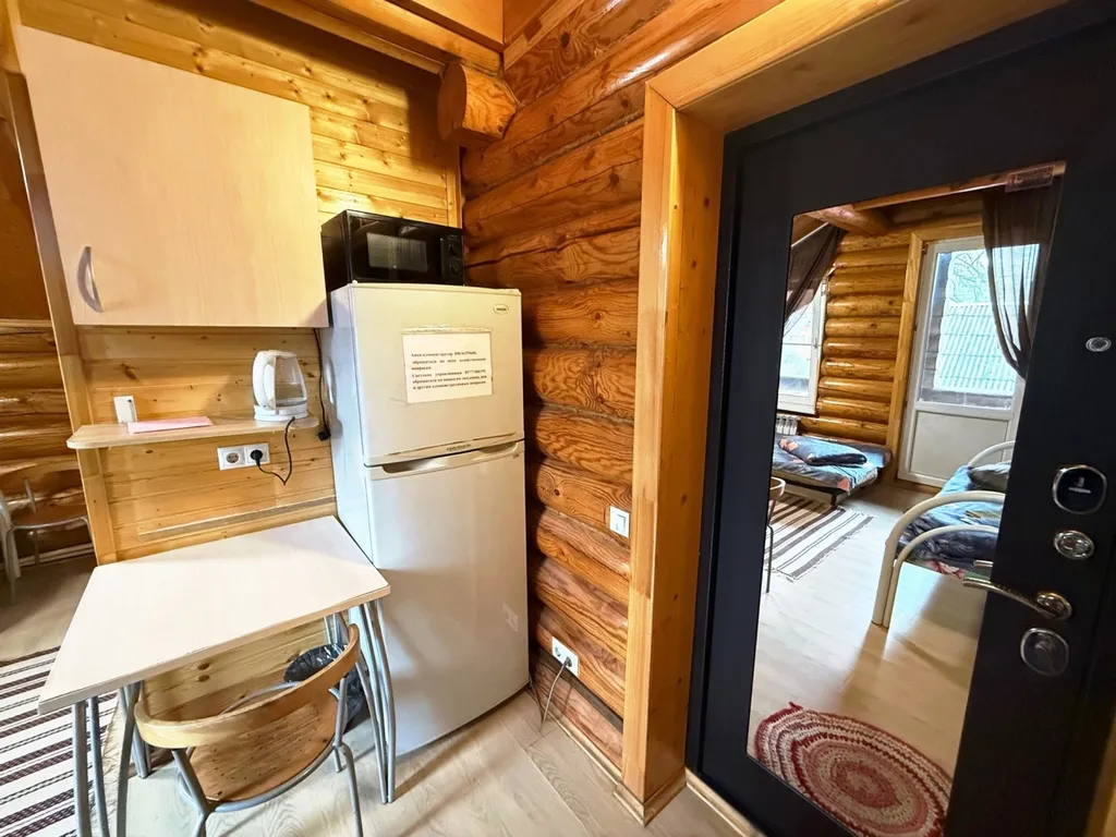 Внутри квартиры-студии имеются полутораспальный диван и две односпальные кровати, балкон для курящих. Также телевизор, холодильник, СВЧ, чайник. Санузел и душевая кабина расположены напротив квартиры-студии в отдельном помещении.