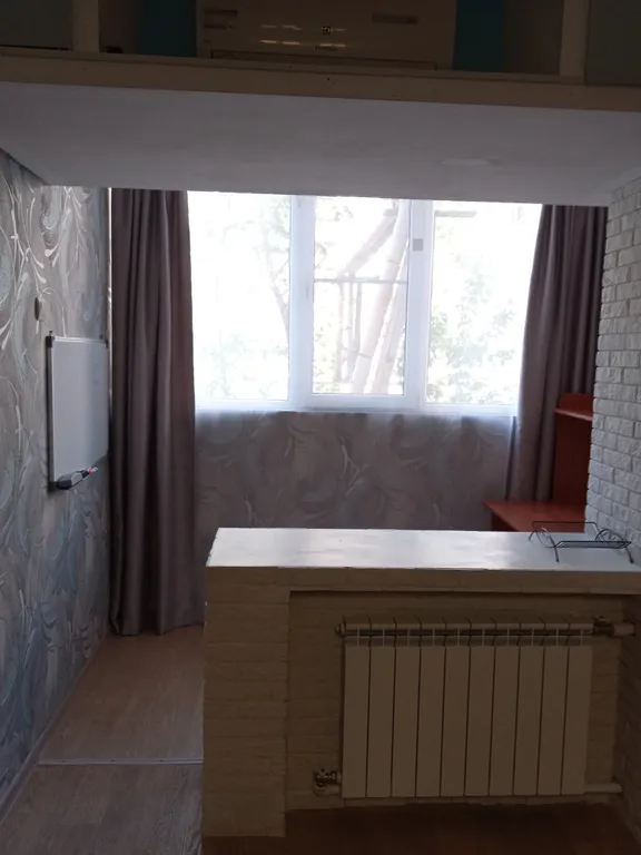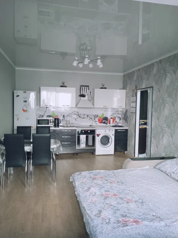 Квартира состоит из двух комнат. Первая: кухня-гостиная с диваном-кроватью 160*200, большим телевизором и кухней, обеденный стол, четыре стула. На лоджии рабочая зона со столом.