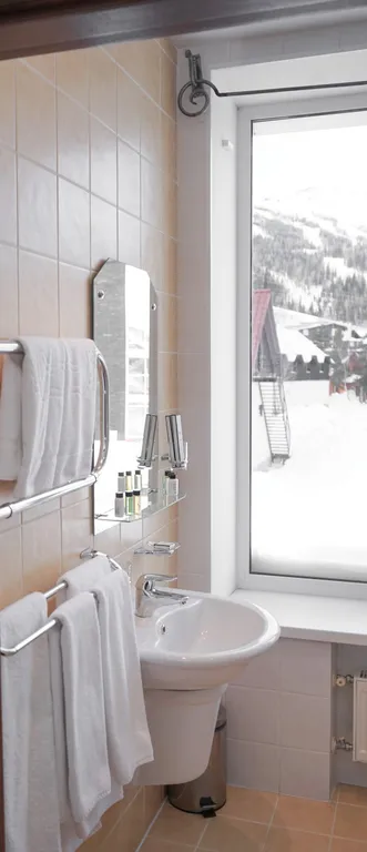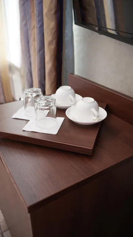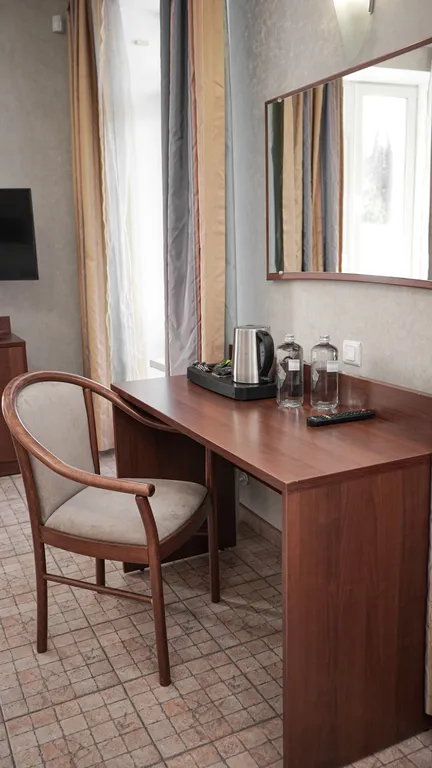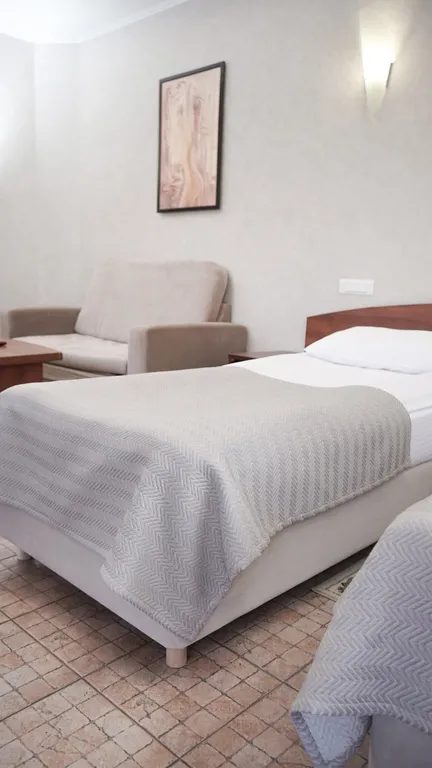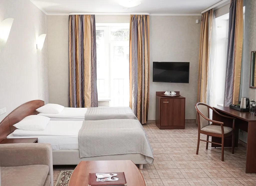 В номере: две 1,5 спальные кровати размером 90х200 см (по запросу мы можем объединить кровати), диван-кровать, кресло-кровать, шкаф для одежды, письменный стол, журнальный столик, чайник, чайный набор, телевизор с плоским экраном, сейф, холодильник, телефон, фен, санузел с душем (комплект полотенец и одноразовой косметики для каждого Гостя).