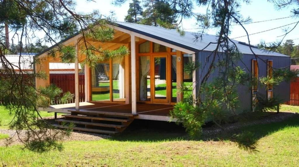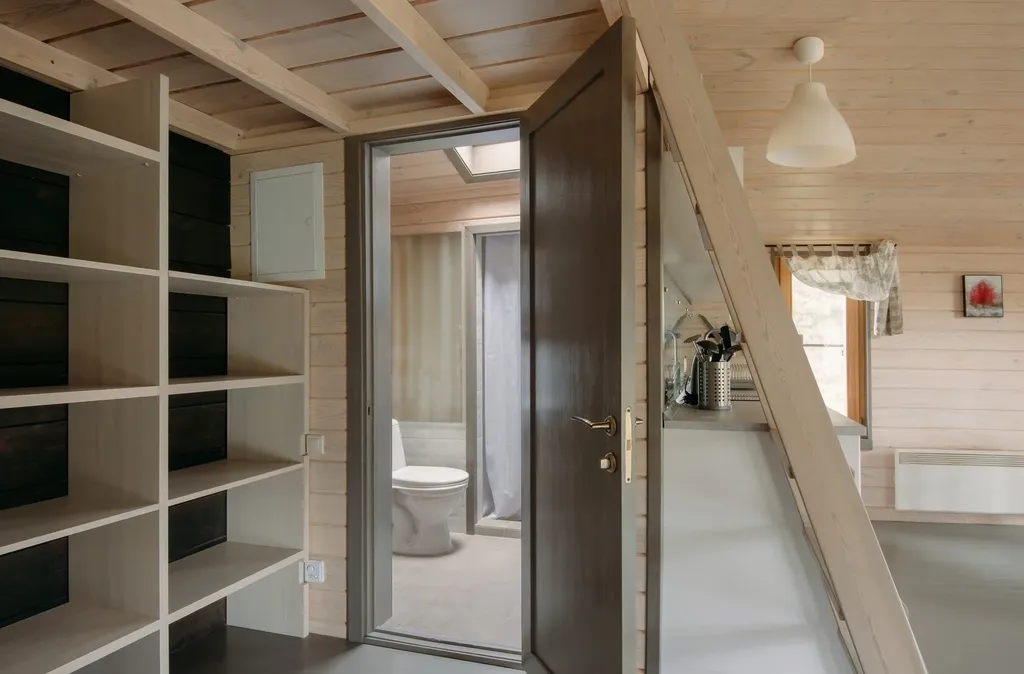 Дом оборудован санузлом с душевой кабиной, теплым полом и комплектом полотенец.