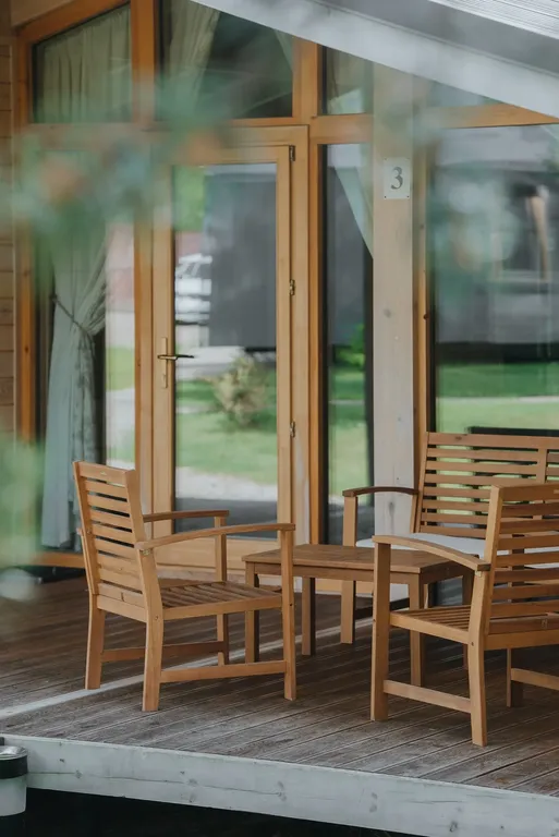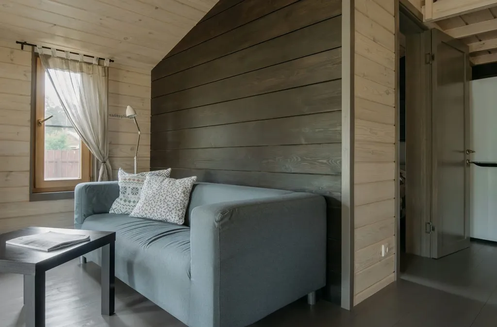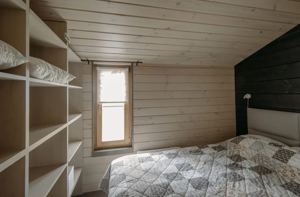 Дом состоит из двух жилых помещений: спальня со стеллажом для одежды и двуспальной кроватью (140х200 см);