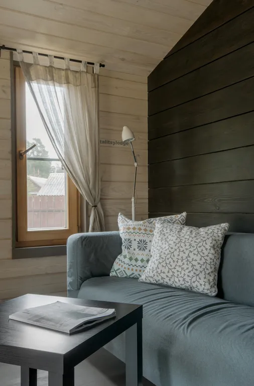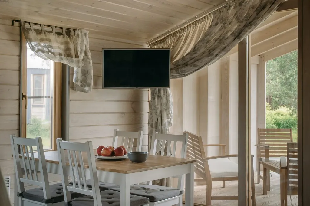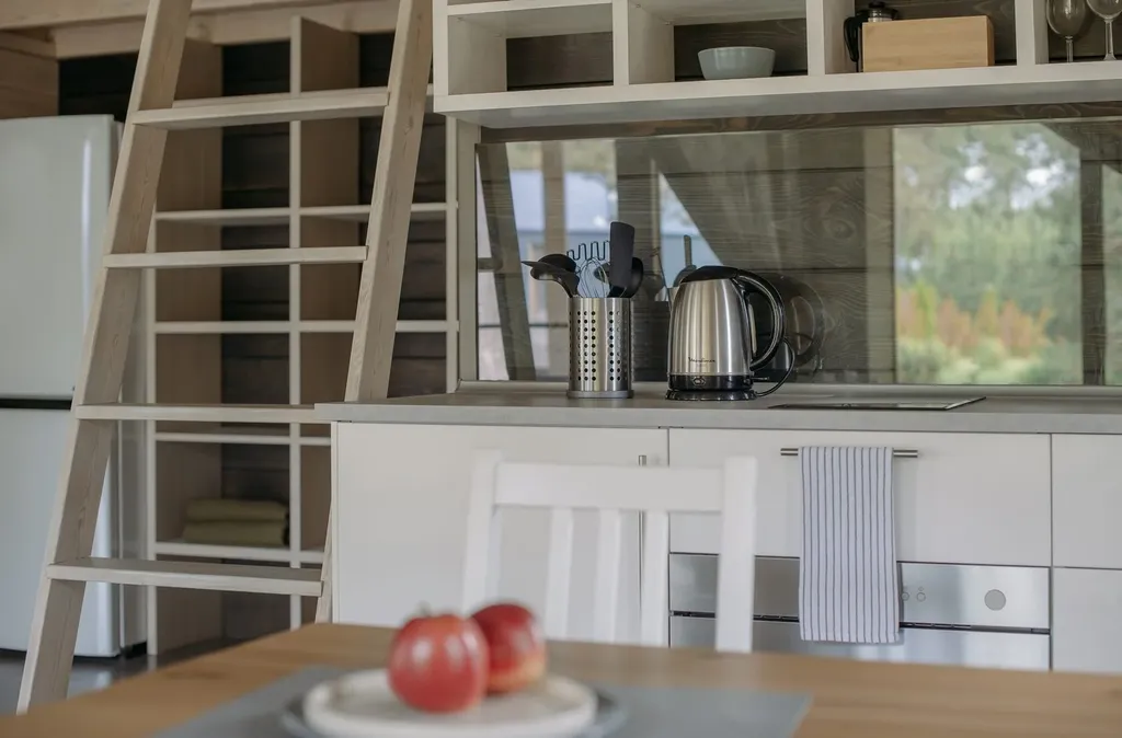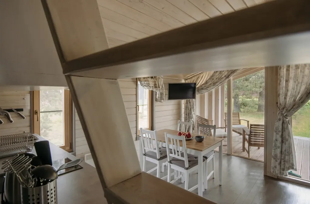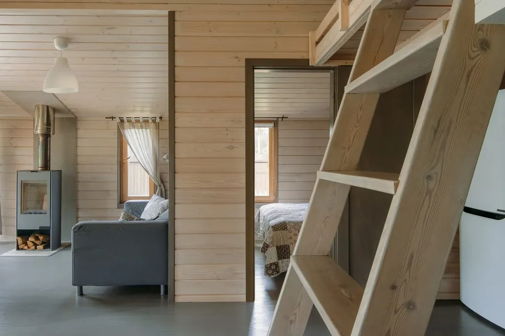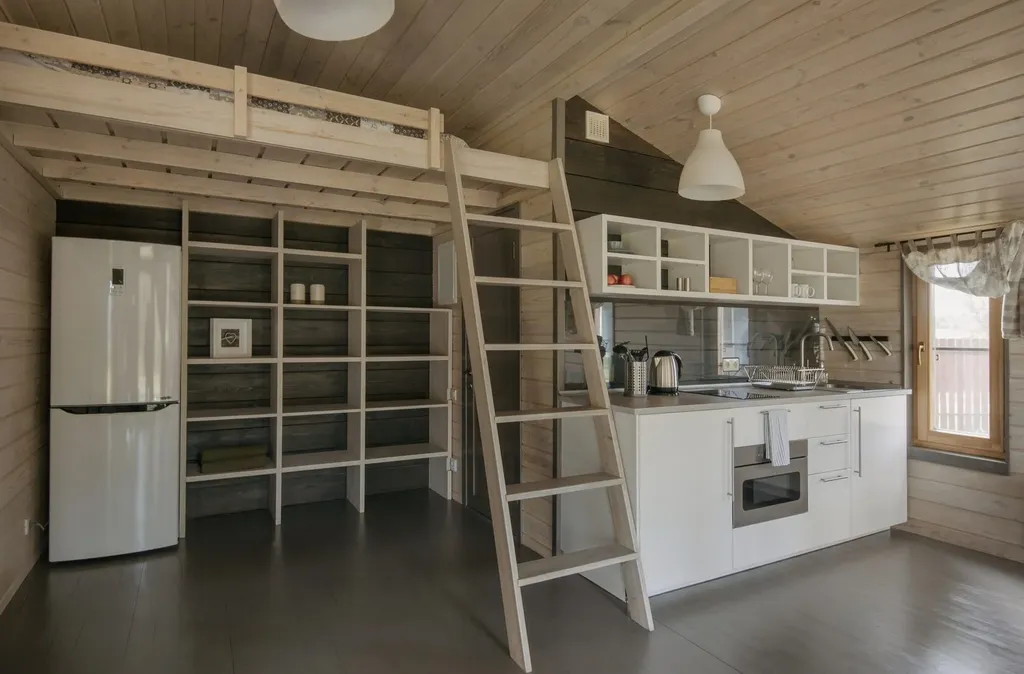 гостиная с двухспальной кроватью-антресолью (160х200) и удобной кухней-столовой с камином, оборудованная всем необходимым для отдыха и приготовления еды.
